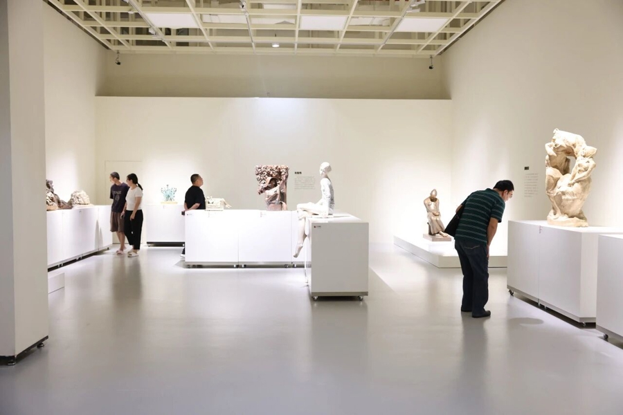 “抒:家国情怀”部分,吴慧明的雕塑赞美劳动者;林蓝以“金版水墨”提炼花鸟精神,寄寓深情;潘缨以马赛克式水墨再现女性形象;周思旻融合东西雕塑语言,形式优美;李传真关注务工群体,结合素描与传统线条,刻画真实人生;沙永汇以宏大木刻描绘时代建设;安佳、邓柯、谢晓虹、朱智伟、唐天衣皆从不同角度表达家国深厚情感。