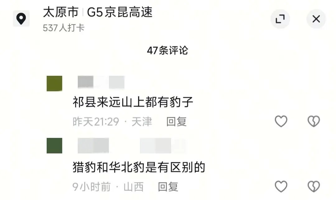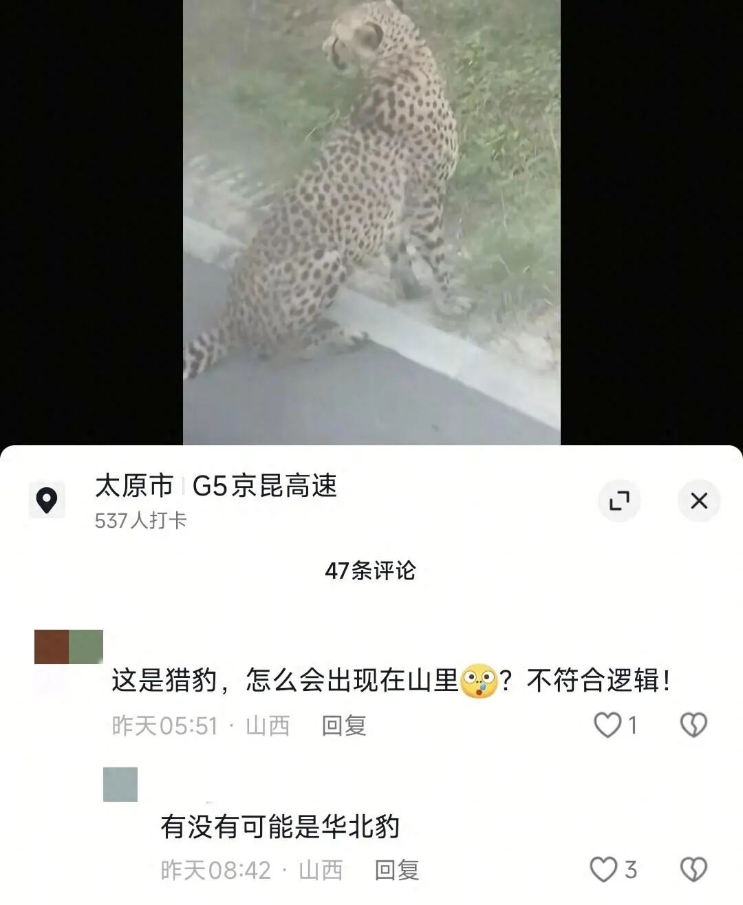 经记者核实,视频发布者主动澄清:视频实为在太原动物园猛兽区参观时拍摄。当时她坐在观光车上,偶然看到猎豹在活动区内驻足,觉得有趣便录下视频。至于定位显示“G5京昆高速”,是因平台自动识别了附近地点,发布时未仔细核对。